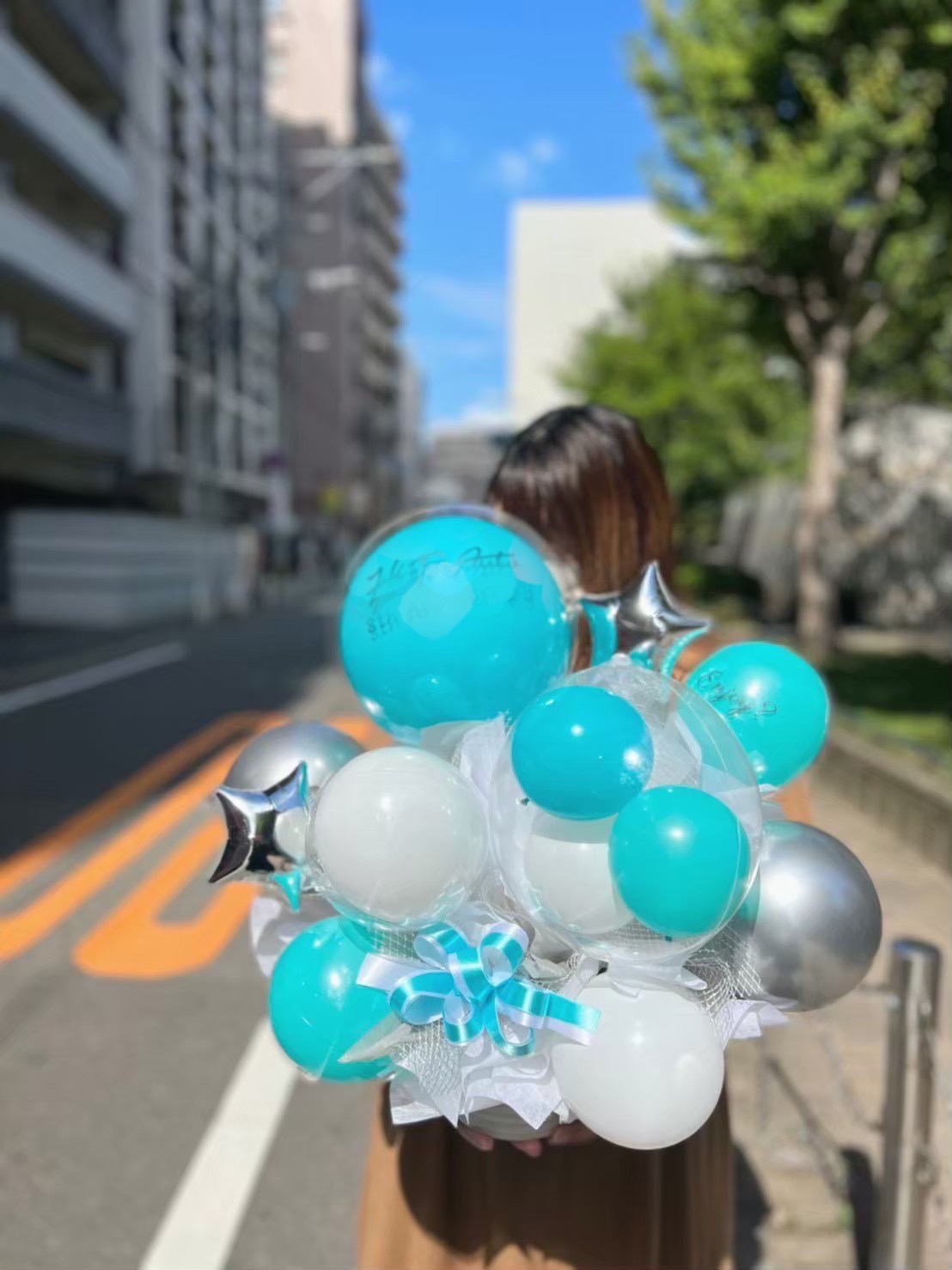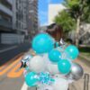 ティファニーブルー×ホワイト×シルバーでまとめた爽やかなイメージのアレンジメント。一番上のバルーンには好きな文字をお入れできます○