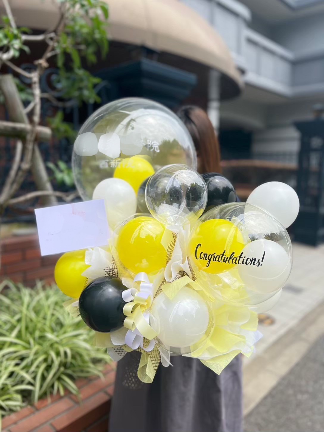 イエロー×ホワイト×ブラックでまとめたかっこいいイメージのアレンジメント。右下クリアのバルーンには好きな文字をお入れできます○