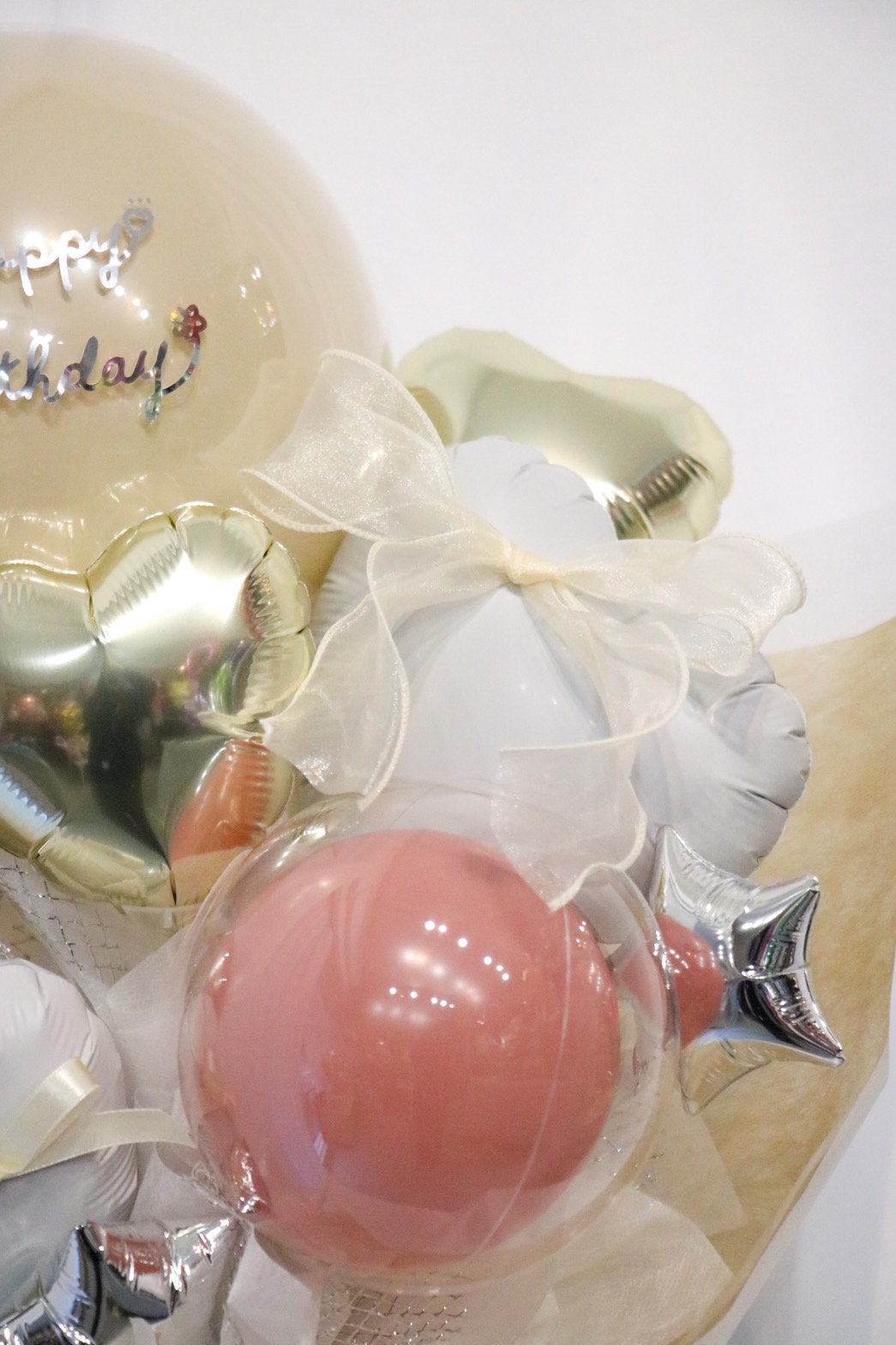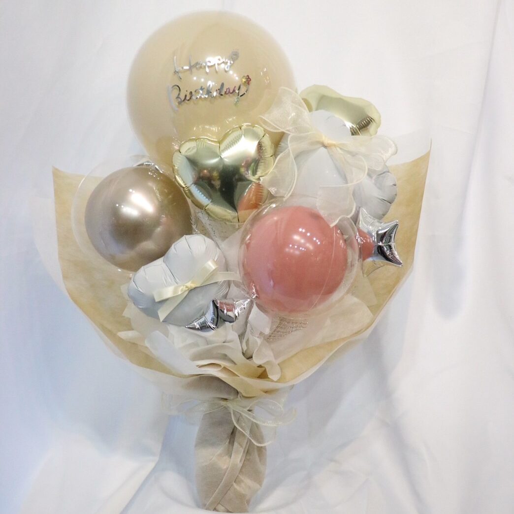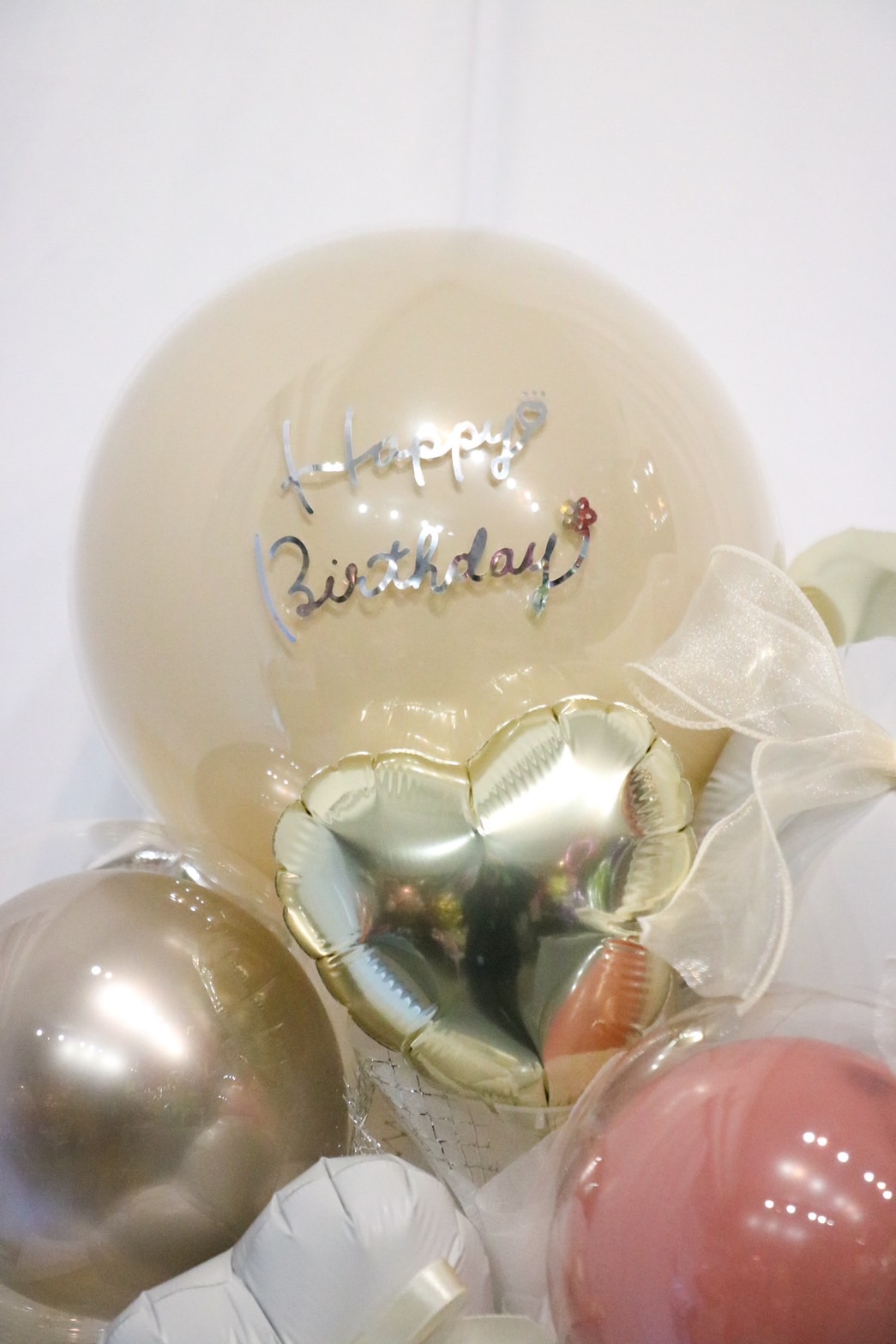 誕生日などのお祝い用に、リボンたくさんのバルーンブーケ