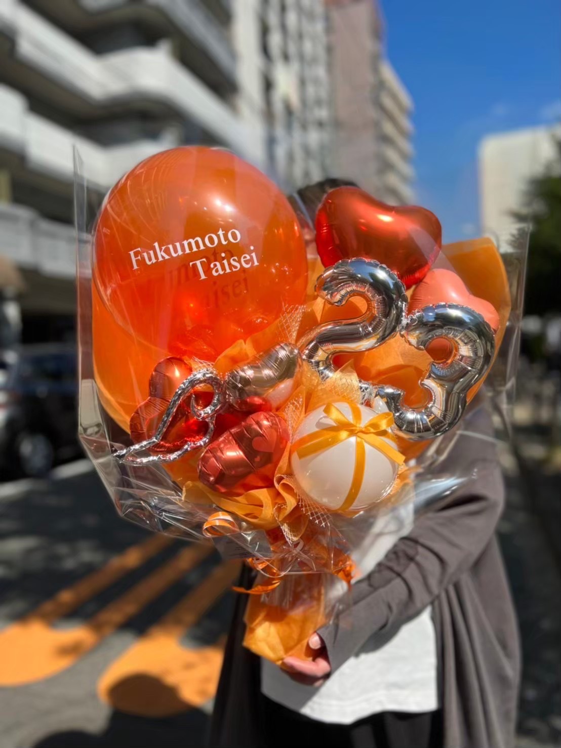 メンバーカラーのバースデーブーケ。花束のような形になっている為、自立しません。一番上のバルーンには好きな文字をお入れできます○数字のバルーンも変更できます。