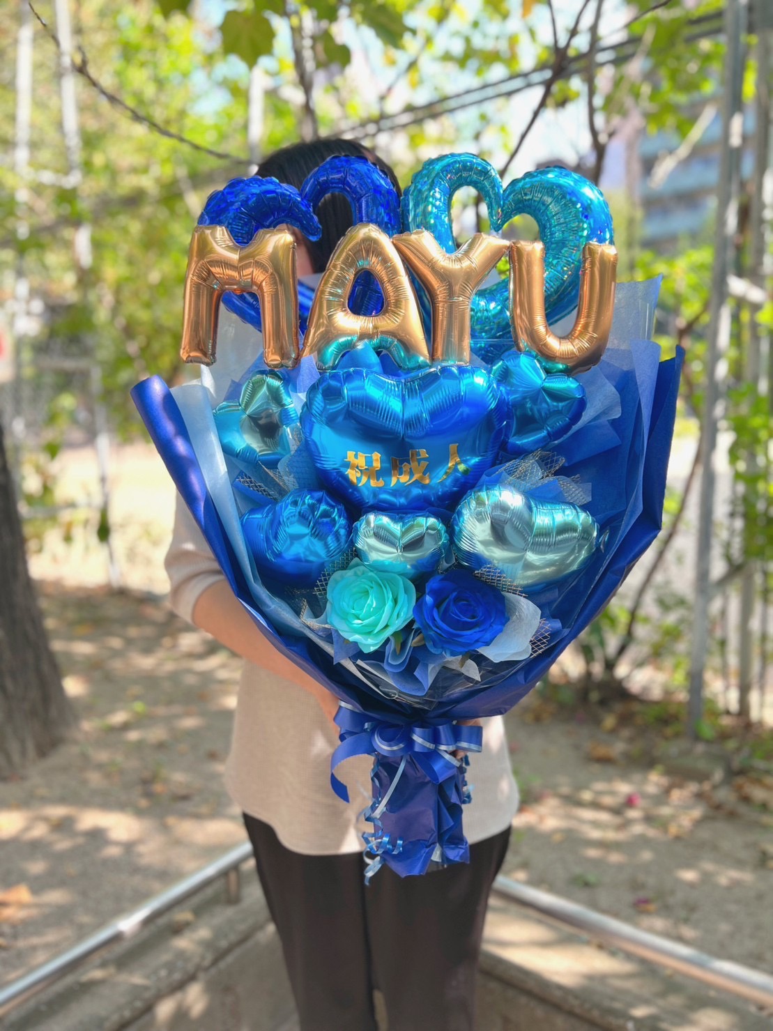 かっこいいブルー系のブーケ。花束のような形になっている為、自立しません。ハートのバルーンには好きな文字をお入れできます○