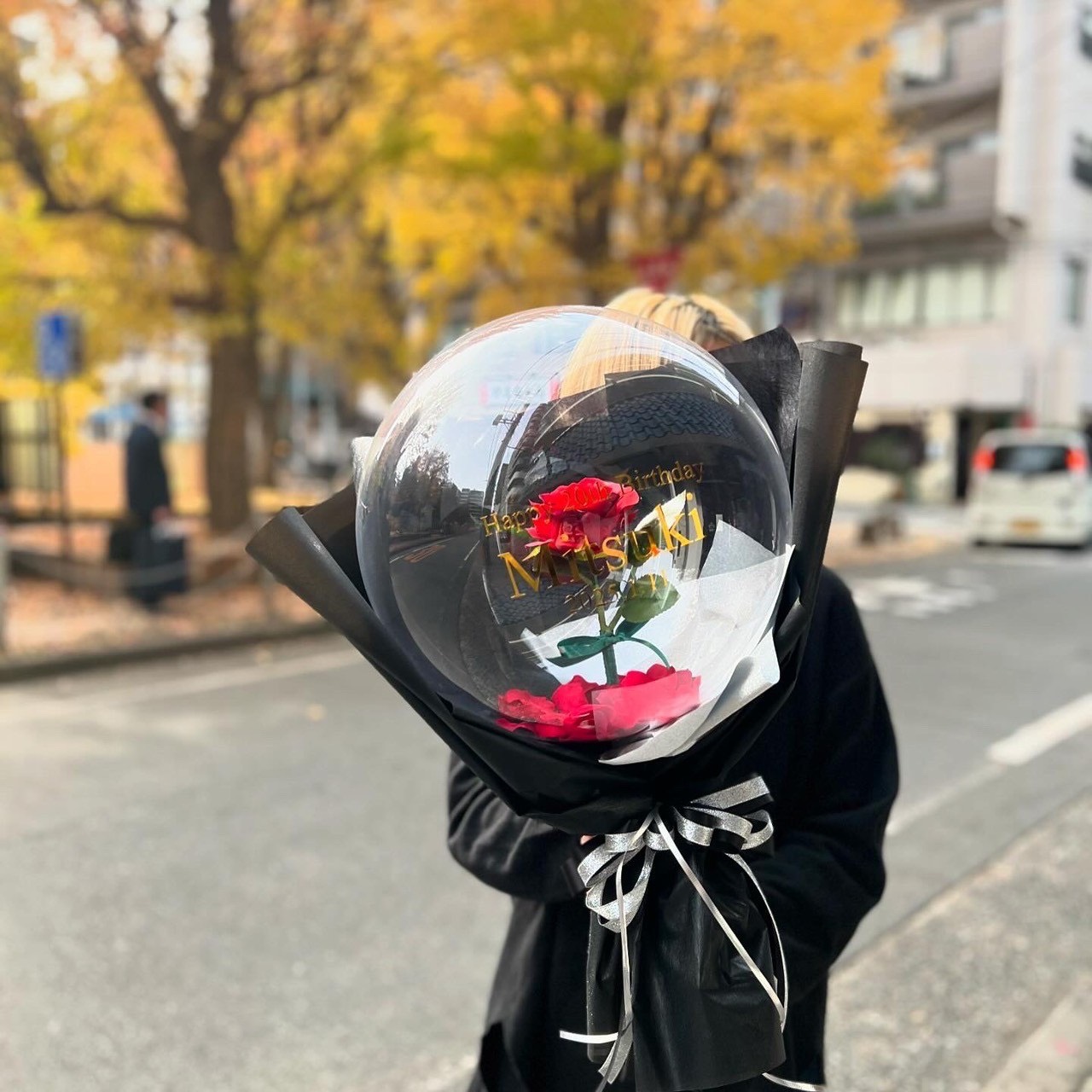 クリアバルーンの中に薔薇の造花を閉じ込めた人気のブーケ。花束のような形になっている為、自立しません。クリアバルーンにはお好きなメッセージをお入れできます。