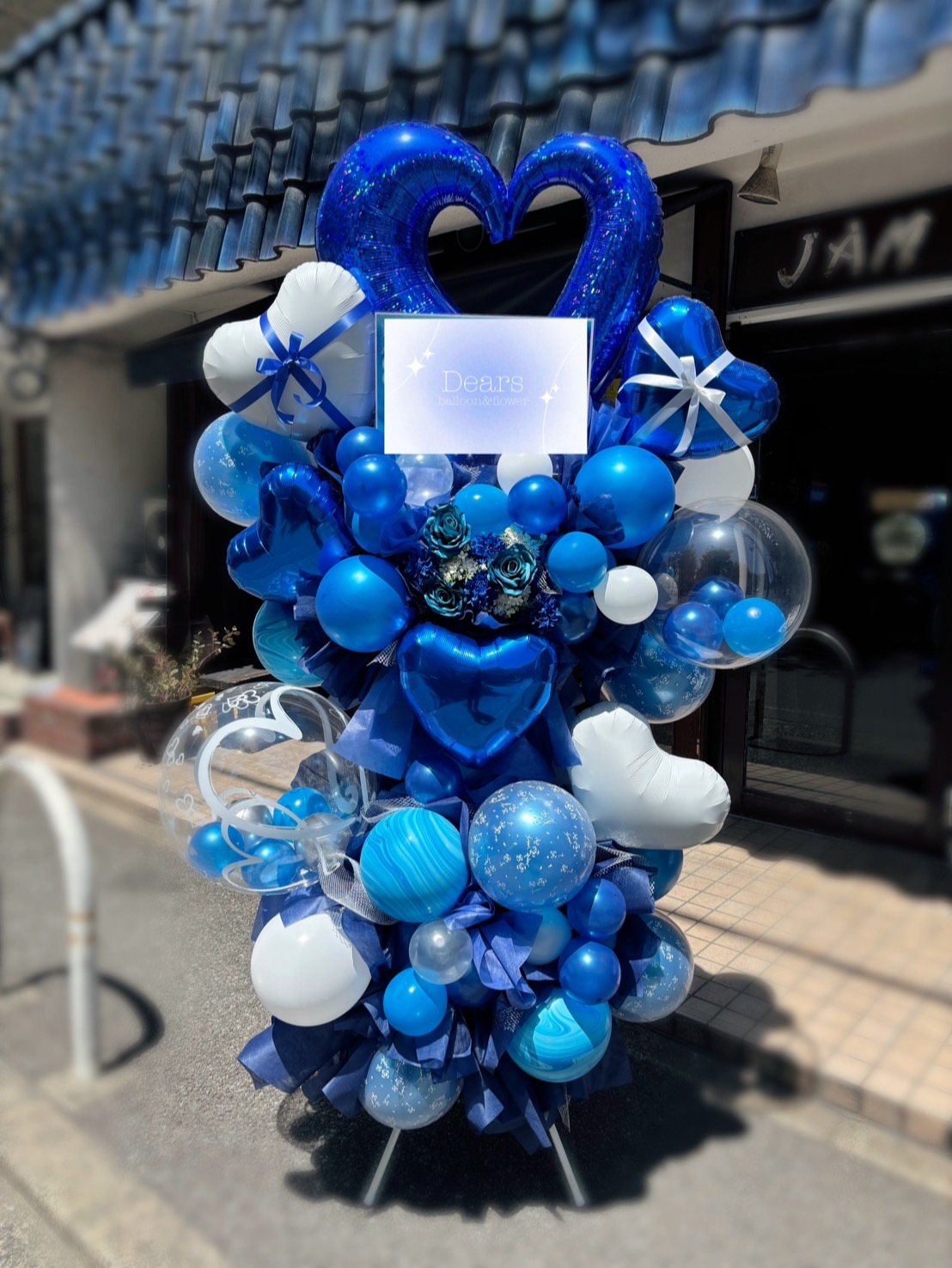 ブルー×シルバーの爽やかで涼し気なお花とバルーンのコラボスタンド