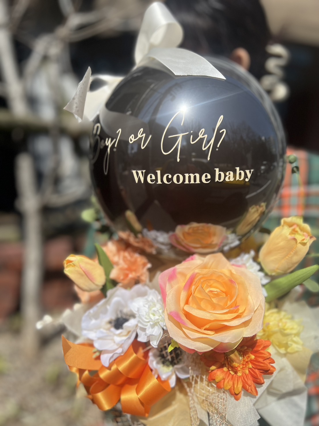 赤ちゃんの性別発表用サプライズバルーン。中身のお色はピンク系かブルー系からお選びいただけます。卓上タイプなので割った後に記念に飾ることも可能です。クリアバルーンの中で割れるので散らかる心配も無し!