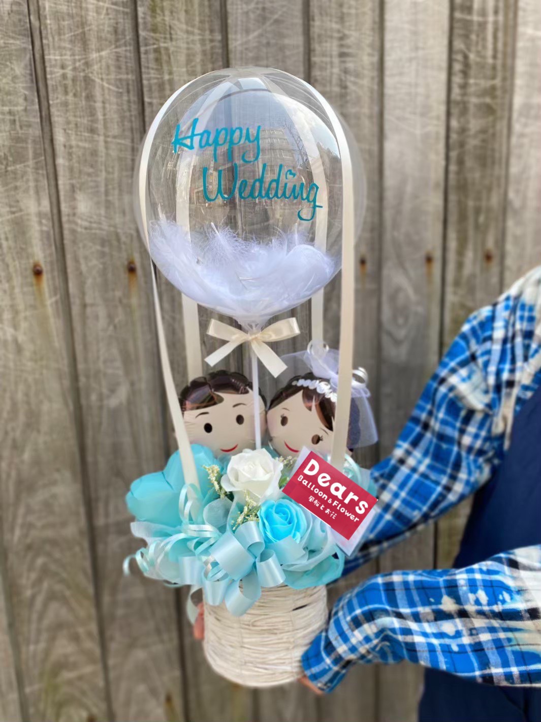 新郎新婦バルーン入り気球型アレンジメント。石鹸で作られたソープフラワーを使用しております。一番上のバルーンには好きな文字をお入れできます○