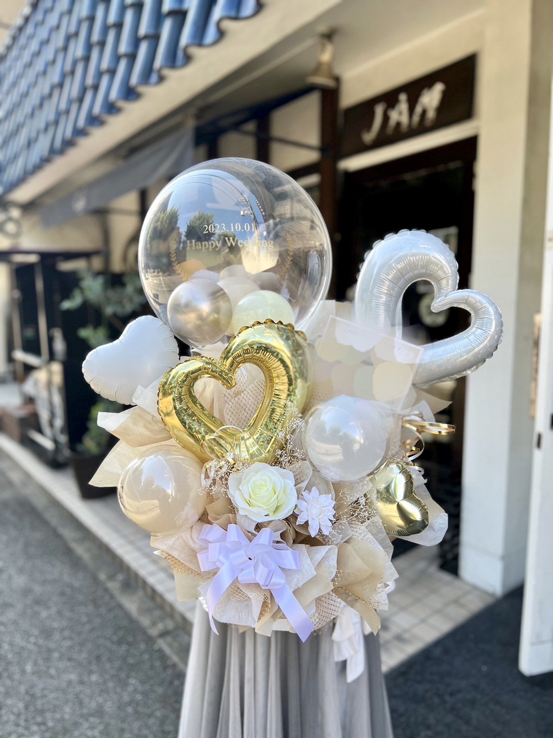 ナチュラルな色味でまとめたアレンジメント。ゴールドが入ることで華やかさもプラスに!一番上のクリアバルーンにはお好きな文字をお入れできます。