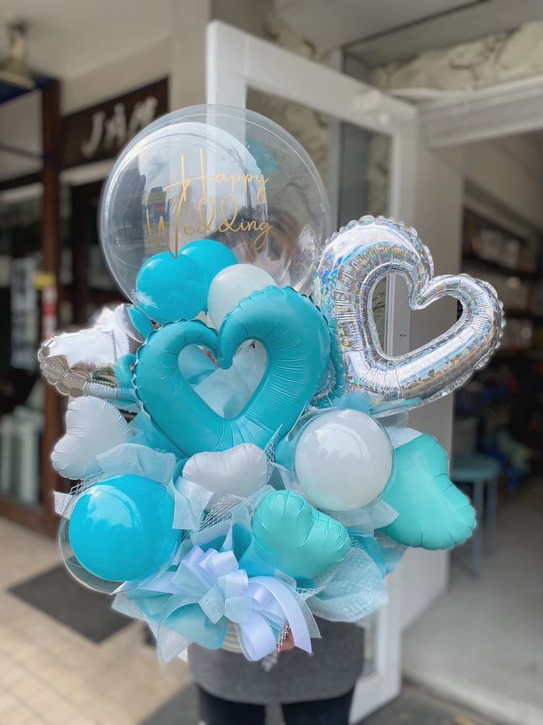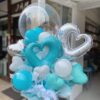 ティファニーブルー×ホワイト×シルバーでまとめた爽やかなイメージのアレンジメント。一番上のバルーンには好きな文字をお入れできます○バルーン電報にオススメ。